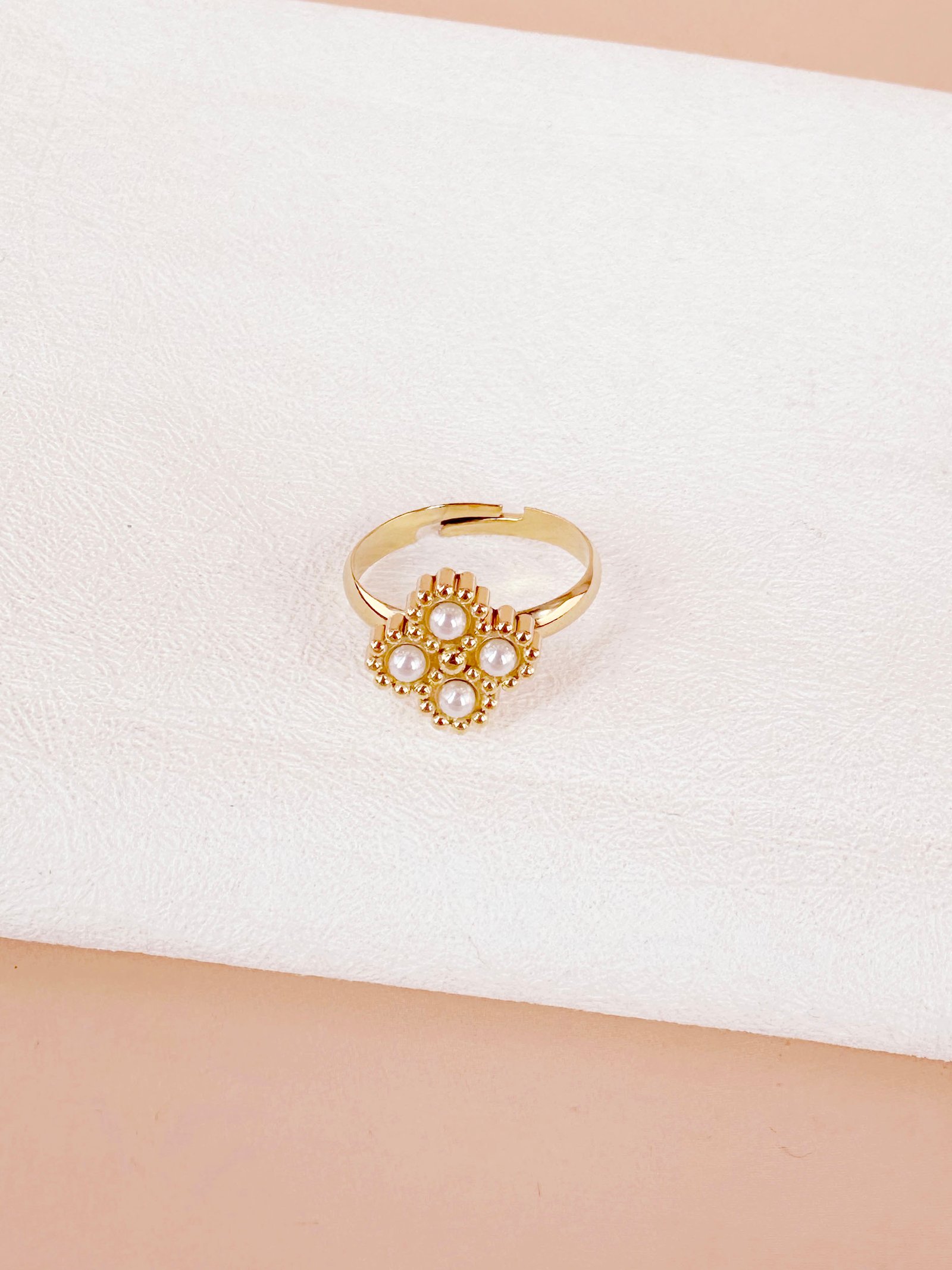 Bague fleurs et perles en acier inoxydable – Taille unique ajustable