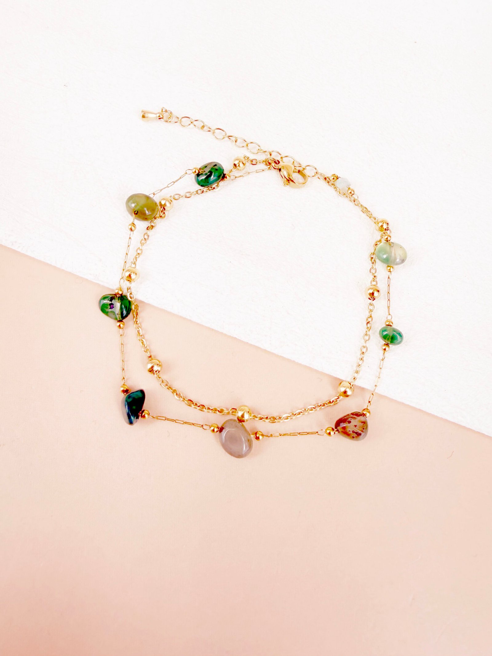 Bracelet cheville Coraya – double chaîne et pierres colorées