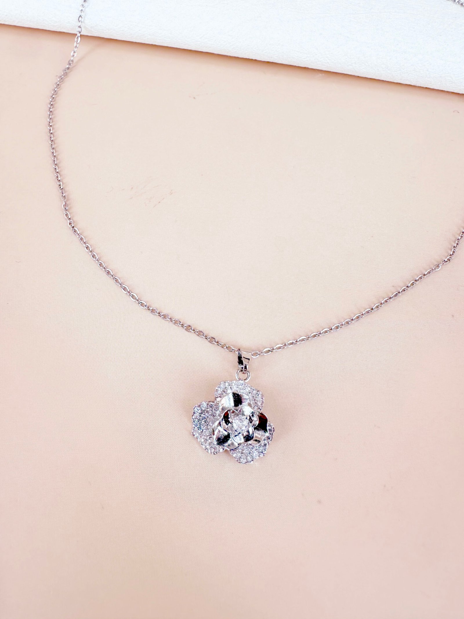Collier anti stress fleur, matière : chaîne acier inoxydable 304 et pendentif en laiton plaqué argent rhodium