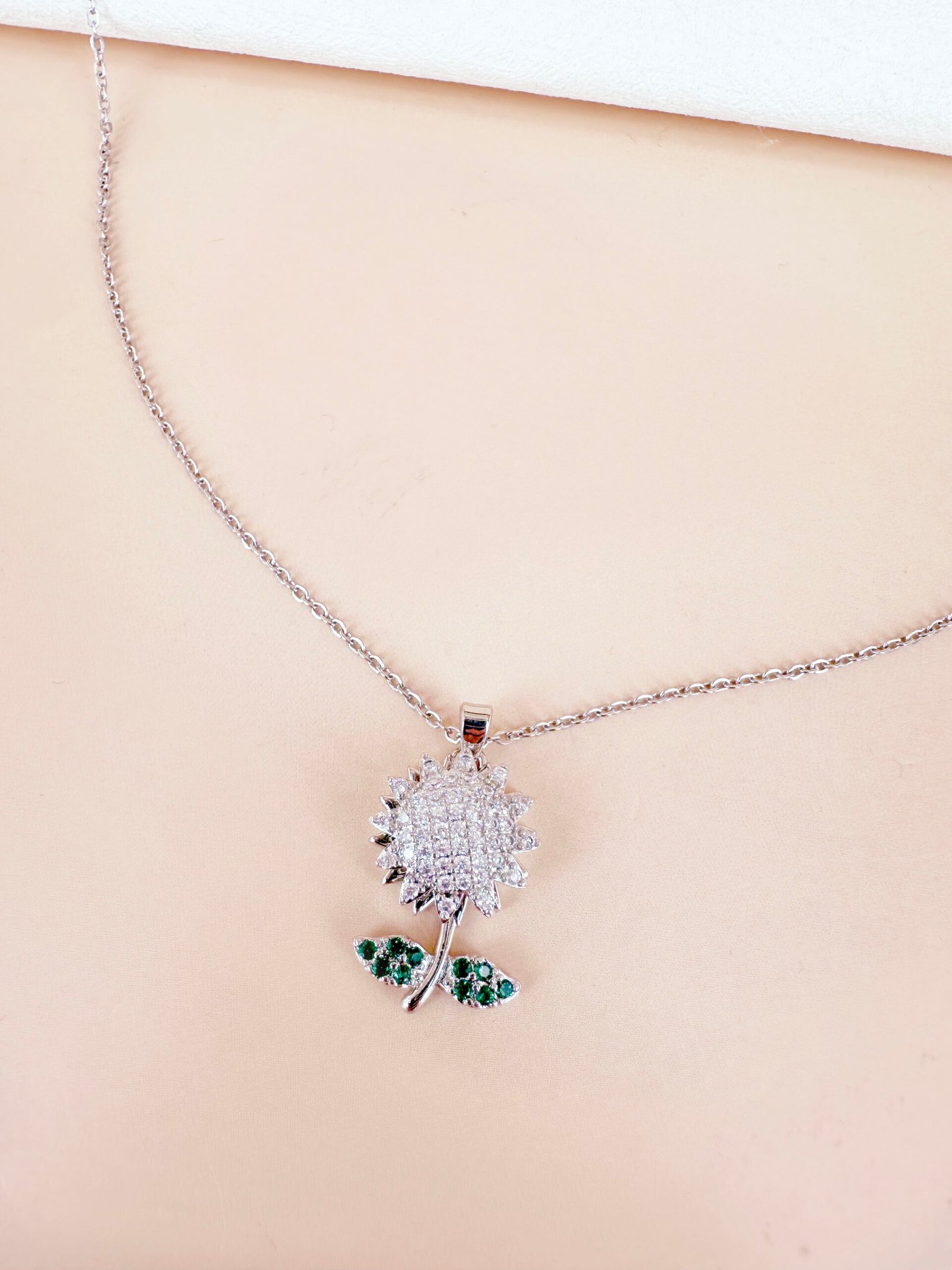 Collier anti stress fleur, matière : chaîne acier inoxydable 304 et pendentif en laiton plaqué argent rhodium