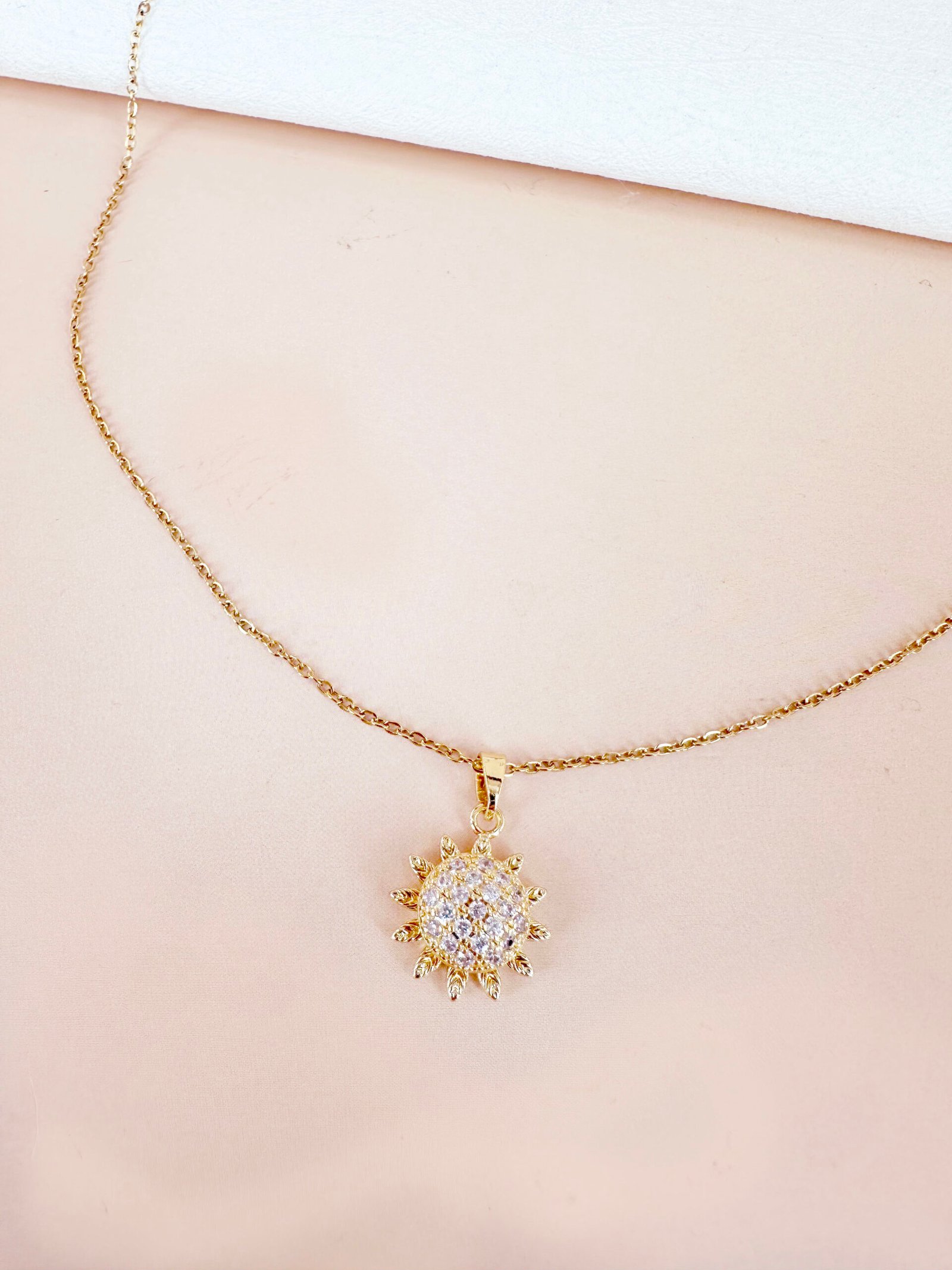 Collier anti stress tournesol, matière : chaîne acier inoxydable 304 et pendentif en laiton plaqué argent rhodium