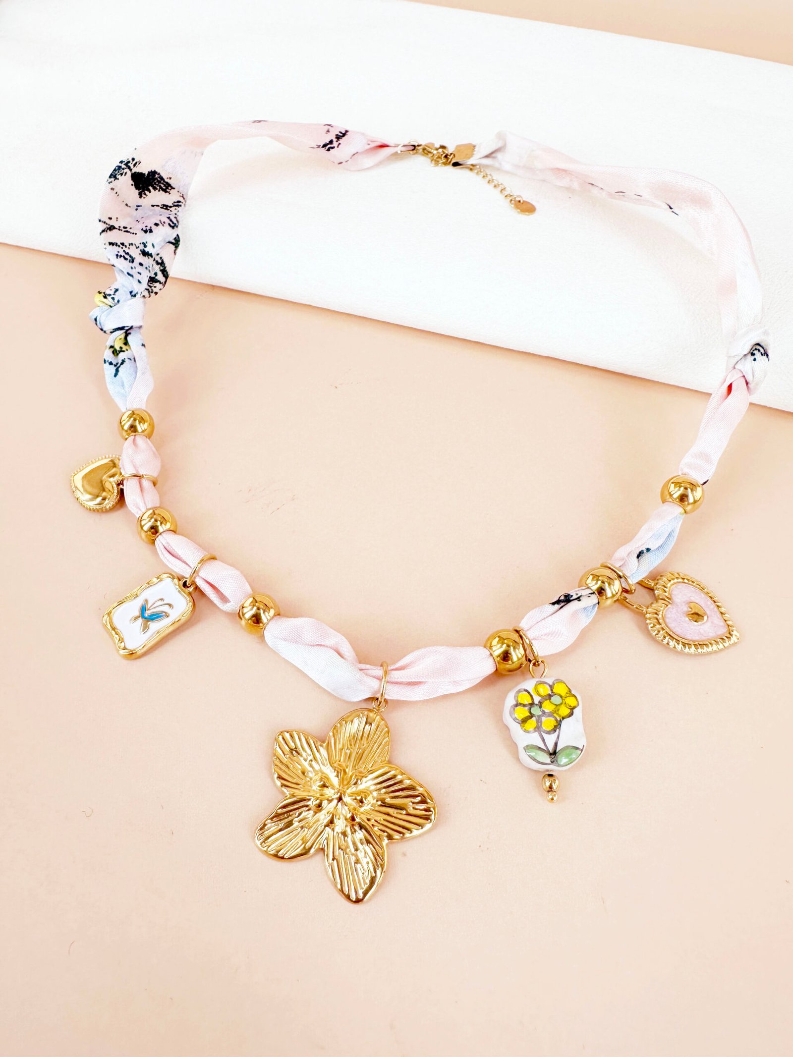 Collier bandana en tissu à breloques fleurs en acier inoxydable