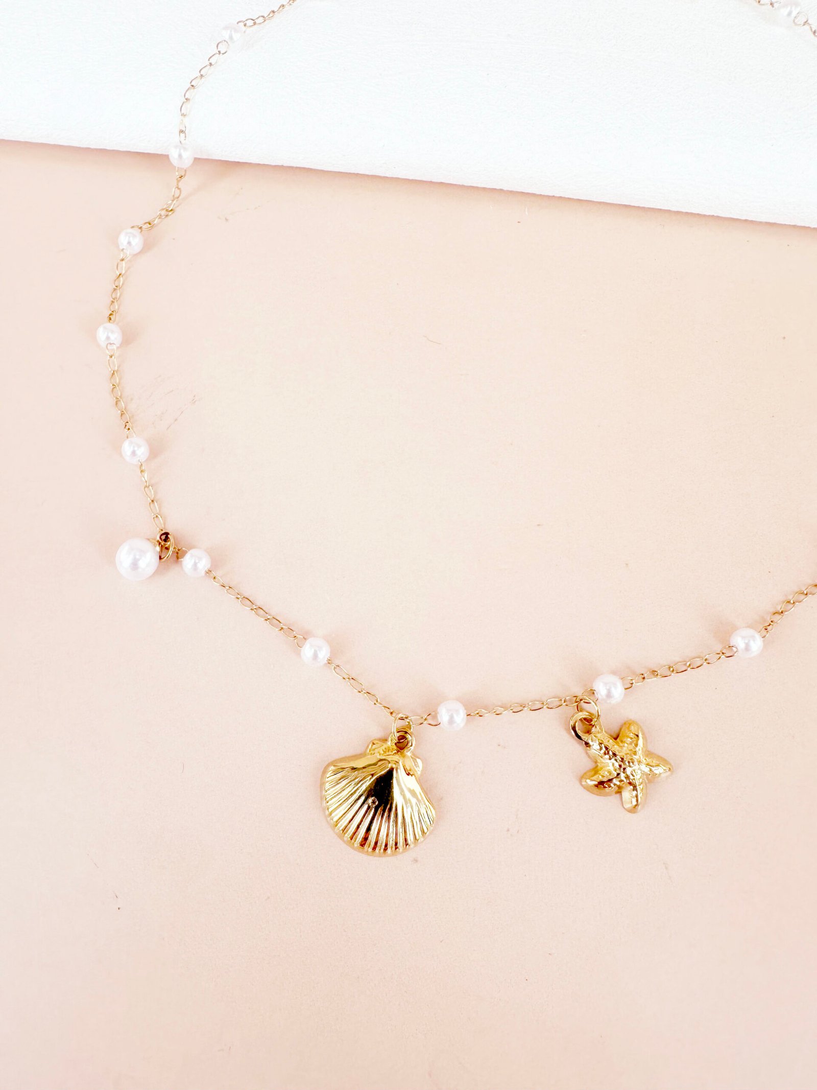 Collier chaîne et fermoir avec breloques coquillage et perle en acier inoxydable