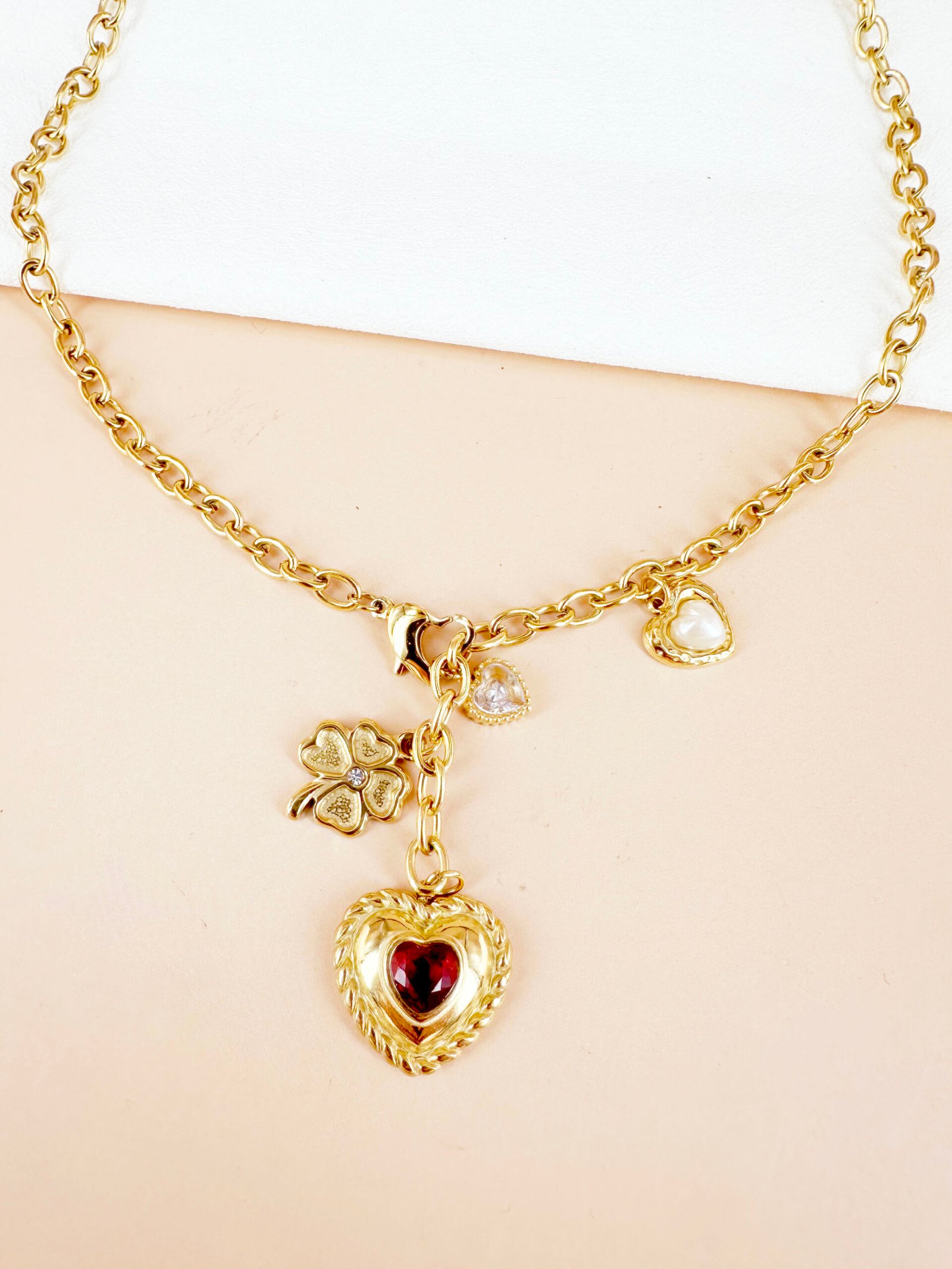 Collier Love fermoir coeur avec pendentif coeur et trèfle en acier inoxydable