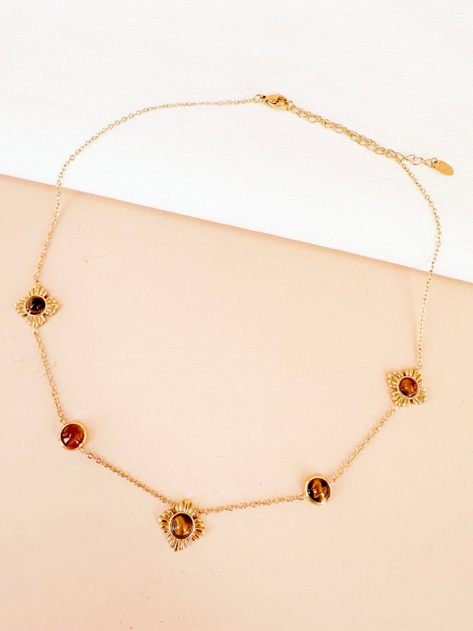 Collier motif fleurs et oeil de tigre en acier inoxydable